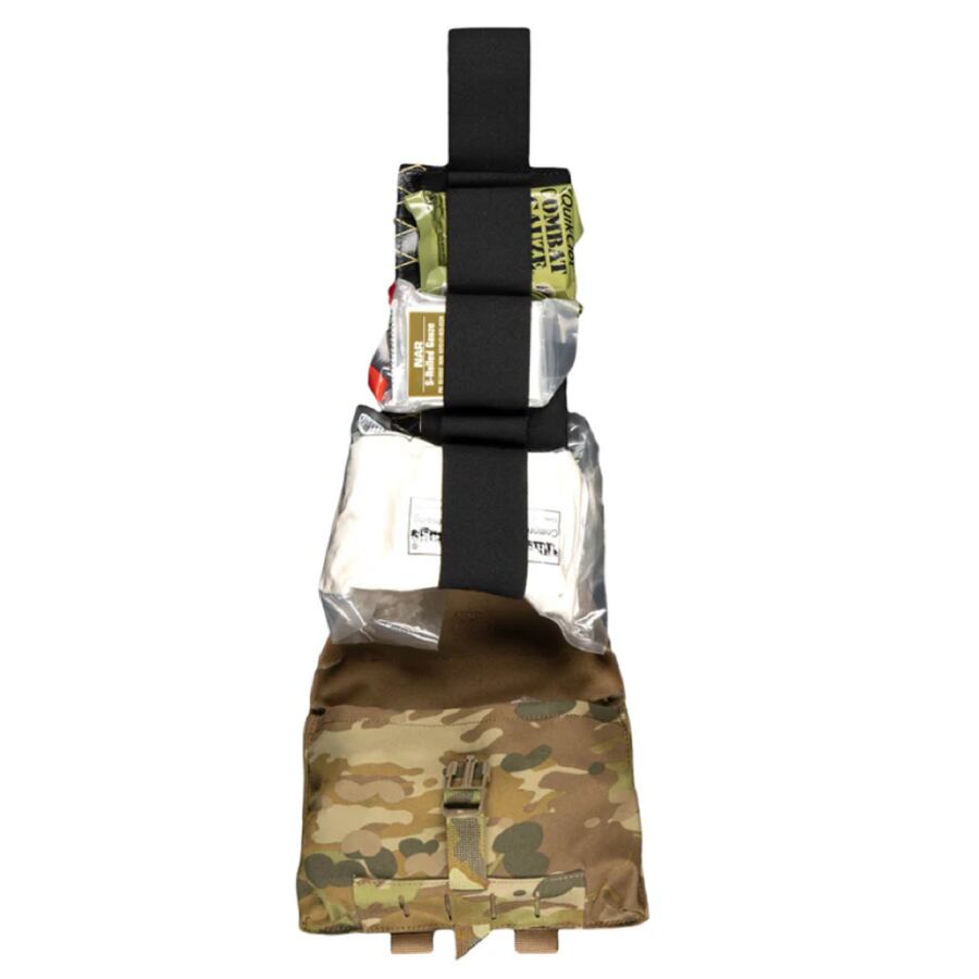 メインコンパートメントには伸縮性のあるTweave®ストレッチポケットを搭載しており、チェストシール、ガーゼ、シアーズ(ハサミ)、気道確保ツールなど幅広い医療キットを収納可能。任務に応じた柔軟な構成に対応します。